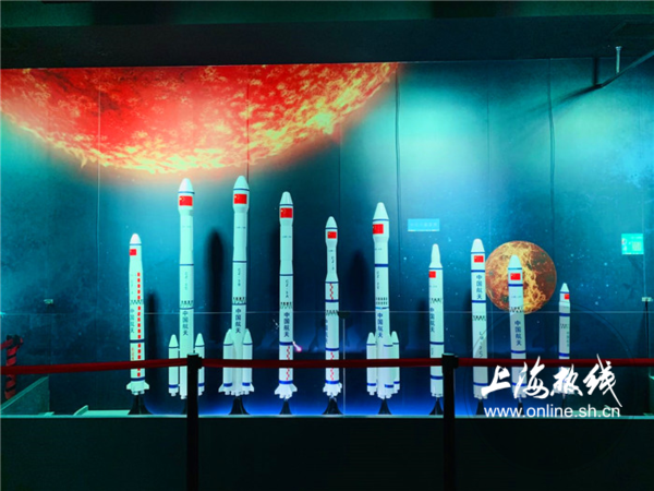 长征火箭家族的模型。这里陈列了长征—号、二号、三号、四号共12个火箭模型,除长征—号为二级火箭外,其余都是三级火箭。