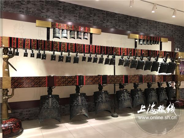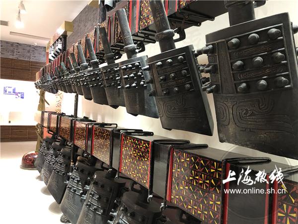 走进馆内,首先引入眼帘的是中国古代乐器展区,让人印象深刻的便是占据展厅最大面积的曾侯乙编钟复制品,被称为“中国震惊世界的10大国宝”。曾侯乙编钟1978年在湖北随县出土,是目前已知全世界最大、最重、音乐性能最完好的青铜礼乐器。全套编钟重5吨,共65件钟,分三层八组悬挂在呈曲尺形的铜木结构钟架上,最大钟通高152.3厘米,重203.6公斤。它高超的铸造技术和良好的音乐性能,改写了世界音乐史。