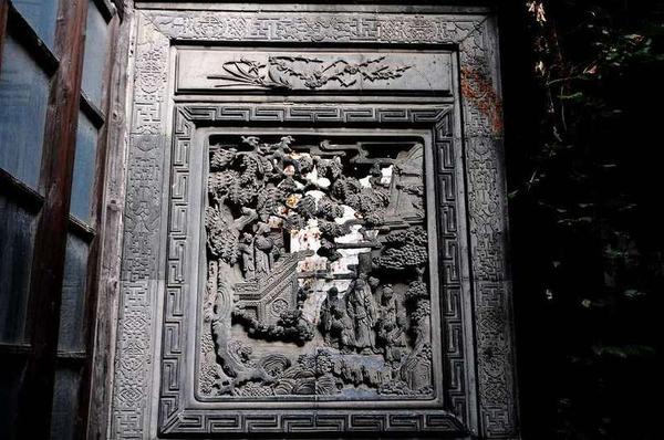木雕部分也很精致,在梁枋、斗拱、云板,以及橘扇、落地长窗的裙板上,各种图案的精致木刻栩栩如生。有梅、兰、竹、菊四季花卉,“天官赐福”及三国故事,以及“长桥卧波”、“垂柳风帆”等江南风光。船厅梁间的垂柱上雕刻的花篮,篮中花卉簇簇,雕工极为细腻。檐枋上雕刻的“七月七日长生殿,夜半无人私语时”,更富诗情画意。其中一幅“吼狮戏珠图”,线条细若毫发,艺术价值很高。