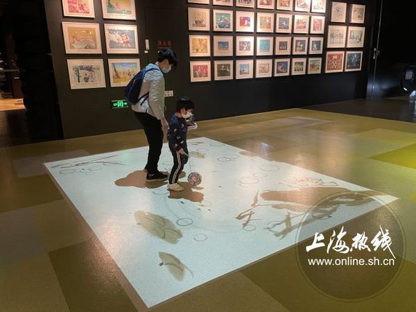 与动画人物合影成了孩子们必打卡的一件事,除了拍照,小朋友还能在家长的引导下,参与展区内的各项互动,如《小蝌蚪找妈妈》等“地投游戏”,看着陈柜里的一张张经典动画片手绘稿,可以了解上海美术片的艺术魅力,与电影大师深厚的艺术造诣。