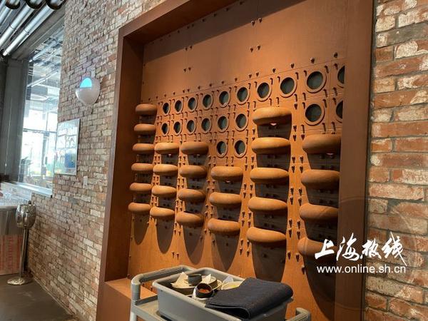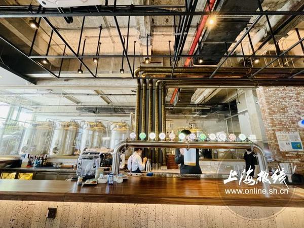 吧台内的10个啤酒发酵罐依次排开,室外的桌椅和外部广场连为一体。以后可以坐在这里一边欣赏烟囱灯光秀,一边品尝美酒佳肴。