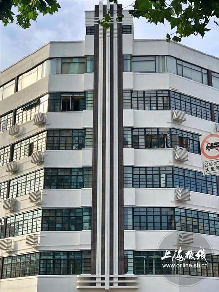 看到淮海大楼的第一反应就是“大”,该建筑平面布置呈L型,建筑立面是装饰艺术派风格,简洁明朗。以浅色的连续窗间墙形成舒展的水平线,在转角立面的视觉中心和两侧中央部分,采用冲出屋面的竖线条,使原来不高的建筑群体有屹立向上的气势。