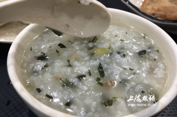 店内粥的品类也十分丰富,有八宝粥、菜肉粥、山芋粥、白米粥,小编选择的是菜肉粥。他们家的粥也很实在,煮的非常粘稠,不像有些粥店的粥一勺下去都是米汤。菜肉粥里还放了一些猪油渣,提升了粥的香味。