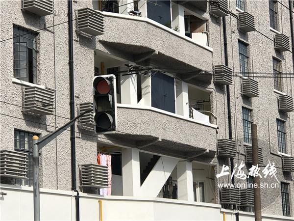 不难发现,瑞华公寓立面两翼均设置两排敞露式的楼梯间,站在马路上眺望便能看到交错的楼梯。楼梯部分的墙面向外突出,与建筑形成凹凸对比,使得建筑的立面更富有层次感。