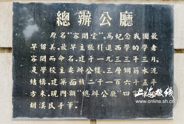 总办公厅原本定名“容闳堂”,为纪念我国最早留美、最早主张引进西学的学者容闳而命名,是学校的主要办公楼。现门额“总办公厅”四字出自胡汉民手笔。