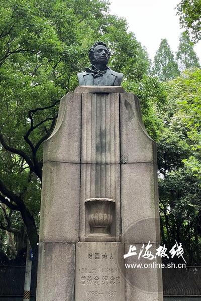 在桃江路1号门口,汾阳路、岳阳路和桃江路三条道路交汇处的街心花园内,坐落着俄国著名文学家普希金的纪念碑,沪上俄式建筑地标之一。这是旅居上海的俄国侨民为了纪念普希金逝世100周年于1937年集资建造的,但由于二战和历史原因,该铜像多次经历了拆除和重建,如今大家所见到的纪念碑,为1987年重建。
