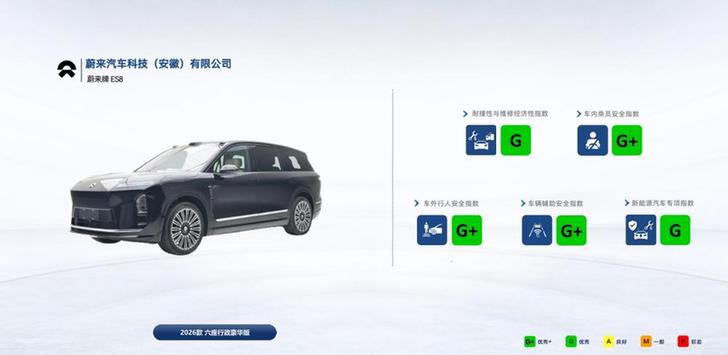【上海热线汽车频道讯】2026年3月26日,中国保险汽车安全指数在北京发布了2026年最新测评结果,蔚来全新ES8获五项全优评价,其中车内乘员安全指数、车辆辅助安全指数、车外行人安全指数均获最高评级G+,新能源专项指数获得最高评级G,在耐撞性与维修经济性指数方面获优秀评级G,综合安全性领跑纯电大三排SUV车型。