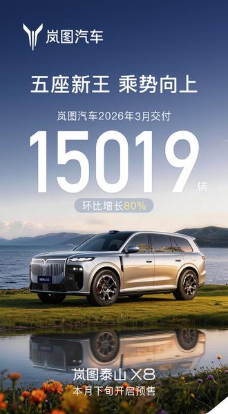 【上海热线汽车频道讯】4月1日,岚图汽车发布3月销量数据,3月交付15019辆,同比增长50%,环比增长80%,1-3月累计交付33892辆,同比增长30%,延续高质量增长。3月,岚图在资本、产品、技术层面三线齐发,开启发展新周期。资本层面,岚图成功登陆港交所,成为“央国企高端新能源汽车第一股”,控股股东一致行动人启动股份增持计划,强化市场信心;产品层面,3月19日,“五座新王”岚图泰山X8全球首发亮相,首发华为双15.6英寸智慧双联屏,搭载华为乾崑896线双光路图像级激光雷达+3固态激光雷达的方案,以“622庭院级标准”即6.1平米座舱空间、可容纳2米大床、后排双享零重力座椅,重新定义大五座SUV市场规则,4月下旬将开启预售;技术层面,岚图L3级智能架构率先量产落地,加速L3级有条件自动驾驶商业化进程。