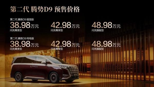 本次下线的第二代腾势D9,正是比亚迪核心技术的集大成之作,新车预售价为38.98万-48.98万。作为全球首款搭载第二代刀片电池的量产MPV,该车搭载比亚迪第二代刀片电池,续航实力全面突破:插混车型纯电续航达401km,纯电车型续航高达800km;并带来“5分钟充好,9分钟充饱,零下30℃充电仅多3分钟”的颠覆性充电体验。第二代腾势D9的长续航+闪充黄金组合,实现充电自由+时间自由+出行自由,让用户真正零焦虑。在智能化领域,新车全系标配天神之眼5.0智能驾驶系统,采用行业领先的全闭环端到端架构,具备自主强化学习能力,可依托海量真实驾驶数据持续迭代进化,实现更平稳的驾驶、更精准的泊车、更迅捷的反应,为用户全程保驾护航。在设计方面,新车内饰采用全新的设计语言,中排升级零压云绒座椅,以百万级的豪华标准,将豪华体验提升至全新维度。