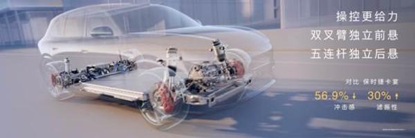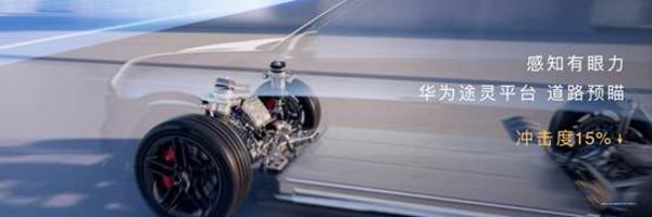 问界M6标配华为途灵平台,前双叉臂独立悬架,后五连杆独立悬架。闭式空气弹簧搭配连续可变阻尼减震器,可实现5挡80mm范围高度调节,阻尼调节频率30次/s。前四活塞固定式刹车卡钳[13],4×46mm活塞卡钳,百零刹停距离33.8m[14]。