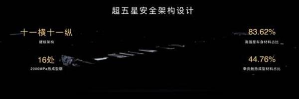超五星安全架构设计,十一横十一纵硬核车身,高强度车身材料占比83.62%,乘员舱热成型材料占比44.76%,全车16处采用2000MPa热成型钢材料。全新一体化加强门环设计,门框强度提升15%[20],创新双C环车身结构,扭转刚度提升133%[21]。
