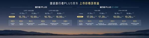 本次上市的捷途旅行者PLUS系列,覆盖“燃油+电混”双动力布局。捷途旅行者PLUS提供2.0TD XWD征服、2.0TD XWD征服+两款配置,官方指导价为17.79万元-18.99万元,超级置换价15.79万元-16.99万元。捷途旅行者PLUS C-DM则推出129km穿越、211km XWD征服两款配置,官方指导价为17.79万元-19.99万元,超级置换价17.09万元-19.29万元。