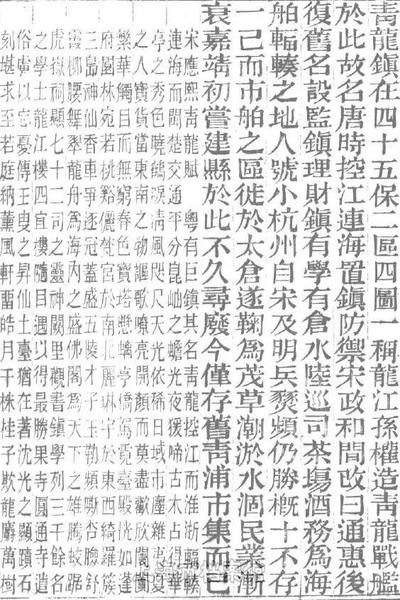 “粤(越)有巨镇,其名青龙。控江而淮浙辐辏,连海而闽楚交通。平分昆岫之蟾光,夜猿啼古木;占得华亭之秀色,晓鹤唳清风,咫尺天光,依稀日域。市廛杂夷夏之人,宝货富东南之物。讴歌嘹亮,开颜而莫尽欢欣;阛阓繁华,触目而无穷春色。宝塔悬螭,亭台驾霓……”