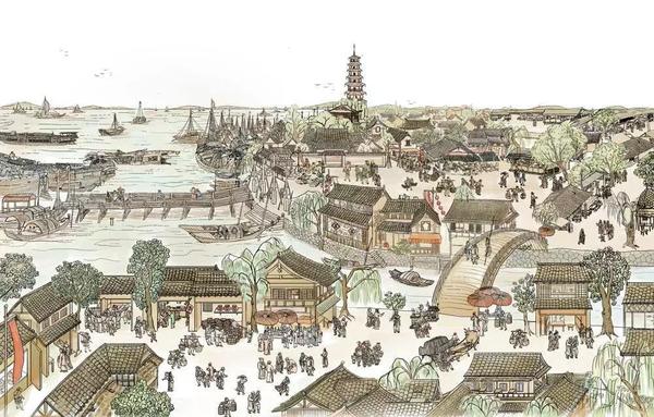 鼎盛时期(两宋)青龙镇港口和社会风貌图。
