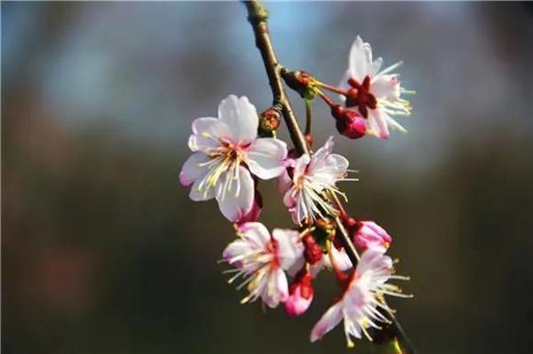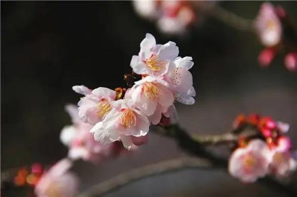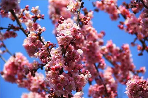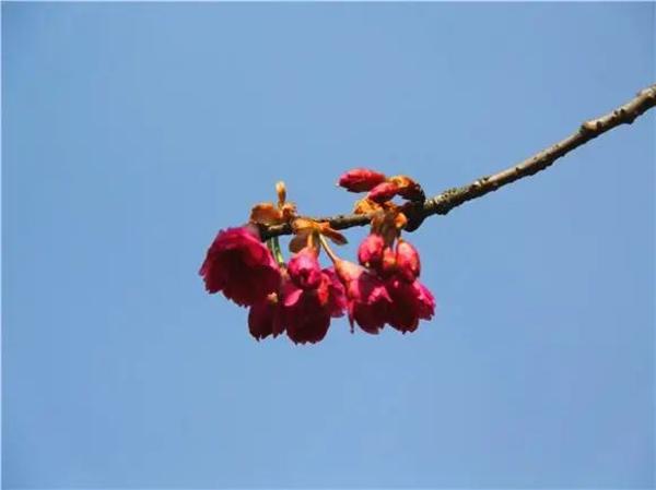 如云似霞踏春来。走至展览温室附近,沿路的‘大渔’樱即将进入盛花期。大岛樱与寒樱的杂交品种。长势强健壮,观赏性好,是花期紧接河津樱之后的早樱花良种,萼筒钟形;花瓣5 枚,淡红紫色,花色明艳,花径较大。