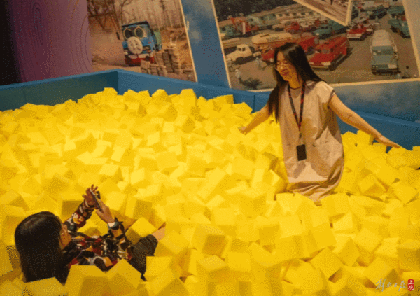 “连轴转了两个月,这么蹦几次是真的解压!”观众小谈蹦进了用海绵打造的艺术装置内。