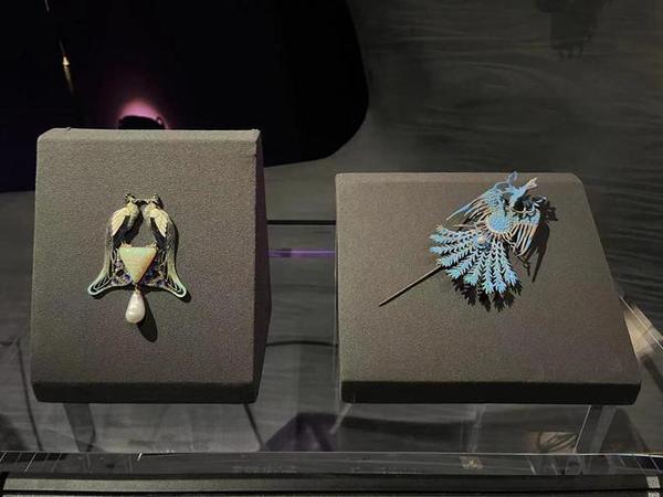 拉利克制作的孔雀和中国传统点翠凤凰。(简工博 摄)