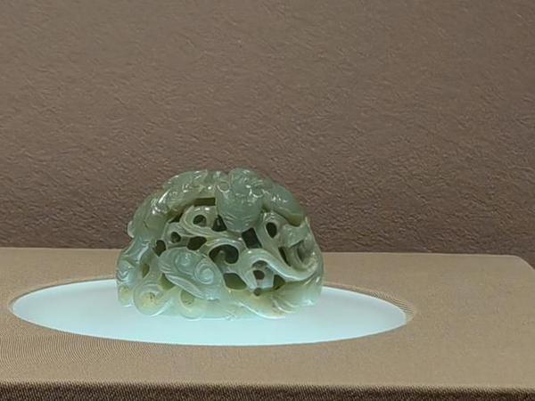 众多表现古代江南和上海地区世俗生活、风土人情的精美器物尤为引人注目。龙、螭、鱼、鹿、鸟等动物题材纹饰的器物按照不同材质“组团”呈现,能看到当时工匠的设计美学和高超的技艺水平。“我们今天可能会对某种动植物产生纯粹的兴趣或者喜欢,但古人往往要言出有意,意必吉祥。这些器物上的龙、鱼、凤鸟、鹦鹉都有自己的吉祥寓意,代表吉祥文化的组成。”上海博物馆考古研究部馆员戎静侃介绍,螭纹在当时非常流行,也演变出各种变体。一件青玉螭的“炉顶”造型独特,螭的形状不仅像虎头一样圆头圆脑,额头上还写了个“王”字。