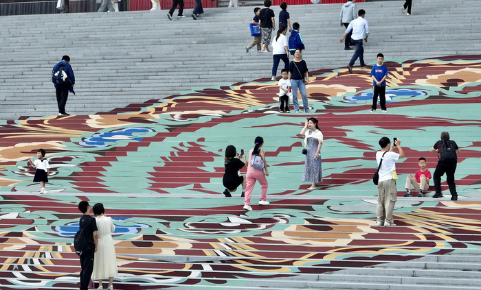 10月1日国庆长假第一天,前来中华艺术宫(上海美术馆)参观的观众无不被场馆南广场大台阶上的“三兔共耳”地贴吸引,纷纷驻足合影留念,“兔”个吉祥,并感叹“中华艺术宫(上海美术馆)每一次的地贴上新都能让人耳目一新,氛围感迅速拉满!”自9月20日开展以来,中华艺术宫(上海美术馆)的重磅展览“何以敦煌”敦煌艺术大展快速火遍全网,为广大市民游客营造了一场身临其境的沉浸式观展体验。而这幅“三兔共耳”就是展方为国庆长假前来参观的观众准备的又一份吉祥与祝福。