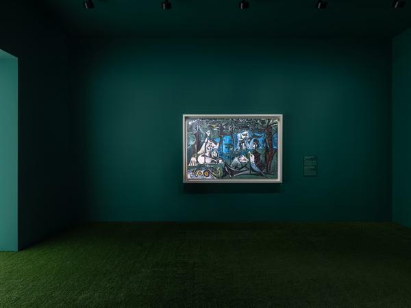 本次展览以十余个主题展厅呈现毕加索创作轨迹。主视觉作品《阅读》中,保罗提取“条纹”元素延伸至展厅墙面;《圣心大教堂》体现立体主义对现实形体的重新组织。儿童主题作品呈现其创作中柔和象征的一面,他借儿童视角寻求摆脱传统规范的可能。标志性作品《牛头》首次来华,由自行车鞍座与车把组合而成,是艺术变形典范。还有《斗牛:斗牛士之死》体现他对斗牛的热情。蓝色时期代表作《男人肖像》展现早期精神基调,《草地上的午餐》系列呈现与艺术史经典的对话,陶瓷作品显示其在材料和形式上的拓展。