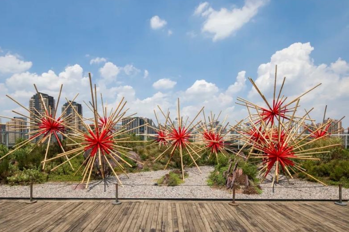 古城公园内“盛放”的五组作品中,来自PSA馆藏的大型装置《火》,出自巴西传奇设计组合坎帕纳工作室,以竹与钢编织的星形结构如庆典焰火般点缀于上海城市天际线上,赞美自然与建构的共生。