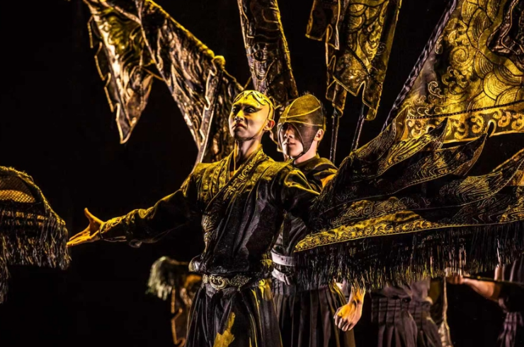 为了塑造这个“站着死去”的英雄,杨丽萍在视觉与肢体表达上做了精心设计。服装由叶锦添操刀,将京剧武生的“靠旗”进行艺术化放大,转化为裙装式设计,既保留其风骨与威仪,又实现舞台化的再造,让项羽在静止时也有千军万马的气势。舞蹈动作则以古典舞与武术为基底,突出霸气和野性的一面,追求扑面而来的原始力量感。