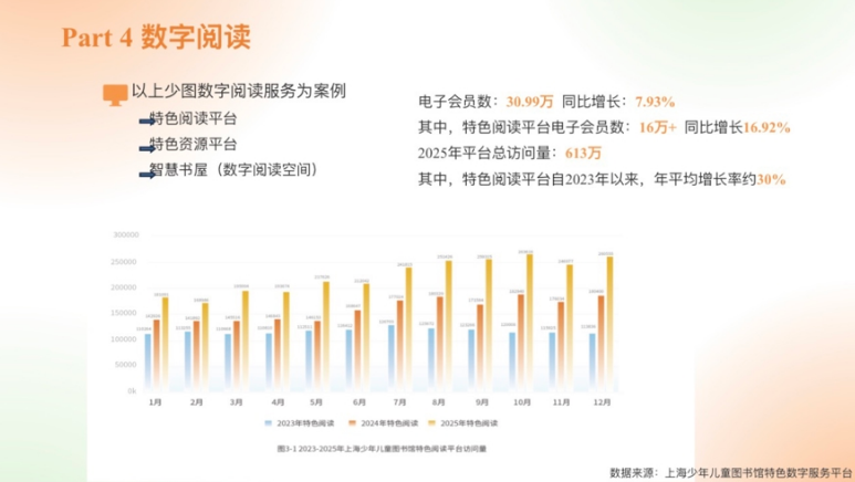 把读者引进来的同时,也要走出去,将阅读服务送到真正需要的人身边。杨燕娜注意到,与成年人多元阅读方式相比,未成年人基于家长对其成长健康、科学用眼等方面的考虑,更多坚持传统纸质阅读。但从近年来上海少年儿童图书馆数字阅读服务平台的浏览数据来看,也连年保持着增长的发展态势。截至2025年底,智慧少儿馆服务系统电子会员注册总数达30.99万人,同比增长7.93%;其中,特色阅读平台自2023年以来年访问量平均增长率均达30%。面对这一趋势,公共图书馆应更好地适应数智化时代发展。