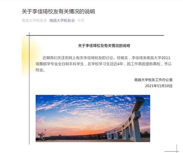 11月10日,据南昌大学校友会消息,其发布关于李佳琦校友有关情况的说明。南昌大学校友会称,近期我们关注到网上有关李佳琦校友的讨论。经核实,李佳琦系南昌大学2011级舞蹈学专业全日制本科学生,在学校学习生活近4年,因工作原因提前离校,予以结业。