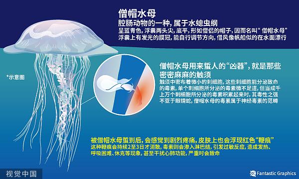 据介绍,“端鞭水母”成体能长到直径六十多厘米,多以浮游生物、小鱼小虾为食,会通过长长的触手,缠绕、麻痹、毒杀捕获物,再将食物送入口中。“端鞭水母”触手的毒性是最强的,一旦被蜇毒素进入人体,可能会出现针扎般头痛,严重的还可能出现心跳加速,造成器官性损害。