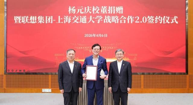2026年4月6日上海闵行校区,联想集团董事长兼CEO杨元庆宣布以个人名义向母校捐赠2亿元人民币,用以改造徐汇校区教三楼,使其焕新成为人工智能学科的科研创新和人才培养高地。