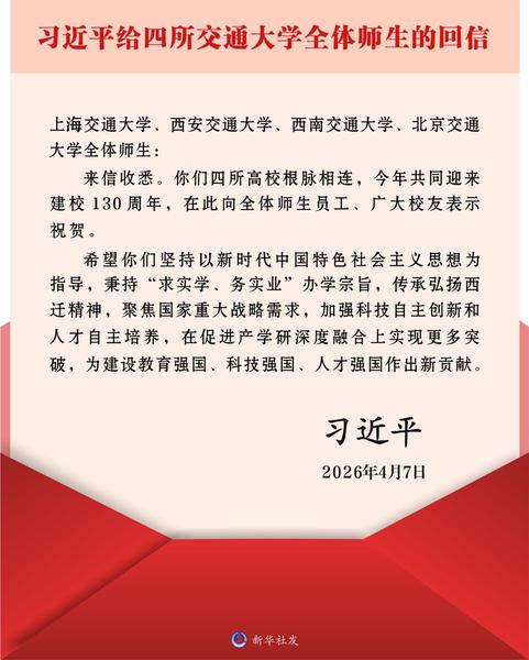 正值4所交通大学建校130周年,4月7日,习近平总书记亲切回信,向全体师生致以热烈祝贺和诚挚问候。在回信中,他希望全体师生员工和广大校友坚持以新时代中国特色社会主义思想为指导,秉持“求实学、务实业”办学宗旨,传承弘扬西迁精神,聚焦国家重大战略需求,加强科技自主创新和人才自主培养,在促进产学研深度融合上实现更多突破,为建设教育强国、科技强国、人才强国作出新贡献。