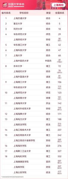 就上海高校而言,同济大学(第18名)位居全国20强;华东师范大学(第29名)、华东理工大学(第42名)、上海大学(第60名)、东华大学(第72名)与以往排名位次均有提升;而在新型研究型大学排行中,上海科技大学(第47名)则稳居全国50强。