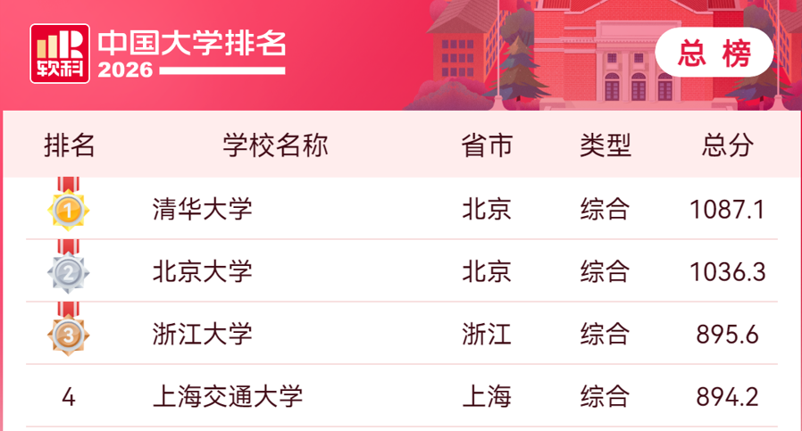 4月15日,评价对象涵盖1000多所本科层次高校的2026软科中国大学排名正式发布。排名中,上海共有30所高校进入全国总榜,其中12所高校荣登全国总榜的百强,百强高校数量仅次于北京和江苏。
