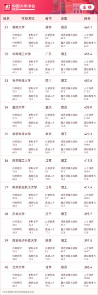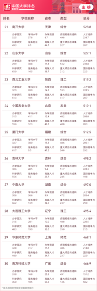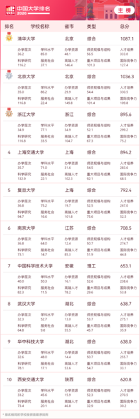 在主榜(即综合性大学排名)中,“双一流”建设高校持续保持优势。在清华大学、北京大学、浙江大学之后,上海交通大学、复旦大学稳居全国前五,其他位列全国前十名的大学依次为南京大学(第六)、中国科学技术大学(第七)、武汉大学(第八)、华中科技大学(第九)、西安交通大学(第十)。