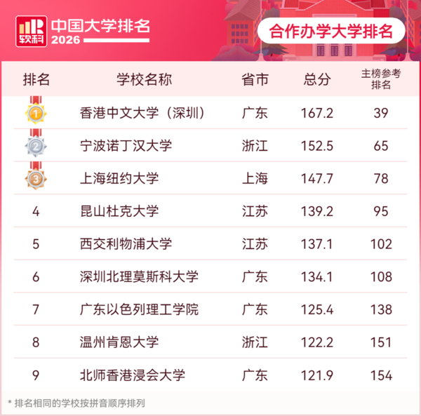 单科性大学排名中,沪上高等院校各显实力。除上海财经大学、上海体育大学分别居于财经类、体育类榜首外,上海中医药大学位列中医药大学排名的第2位;上海外国语大学在语言类大学排名中位居全国第2名;华东政法大学也居全国政法类大学第2。此外,上海纽约大学不仅跻身公办总榜百强、位列全国第78名,还在合作办学大学排名中位列第3名,排名在先的分别是香港中文大学(深圳)、宁波诺丁汉大学。