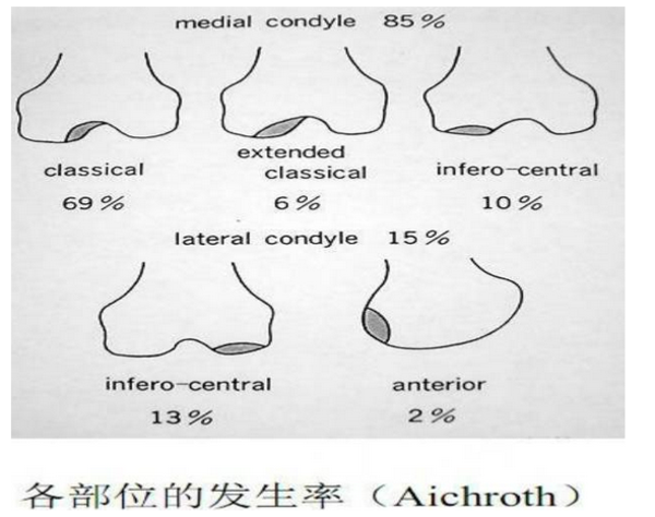 关节内的骨软骨病,病因不明,关节软骨和软骨下骨变性和再钙化,最常见于股骨内髁,模糊的、定位不清的膝关节疼痛,有晨僵,反复的关节内积液(轻度)。如有游离体,可发生交锁症状。股四头肌萎缩,受累股骨髁关节软骨面压痛。