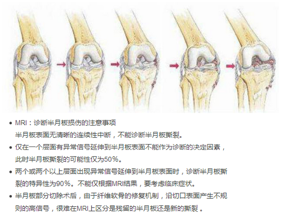 发生于膝关节突然旋转损伤,如跑步者突然改变方向,也可发生于慢性退变过程中,尤其是有膝关节不稳定时,反复膝关节疼痛,交锁时加重,下蹲或膝关节旋转时可引发交锁,轻度积液,关节线压痛,股内侧肌萎缩, McMurray试验阳性 (阴性不能排除诊断)X线平片阴性。