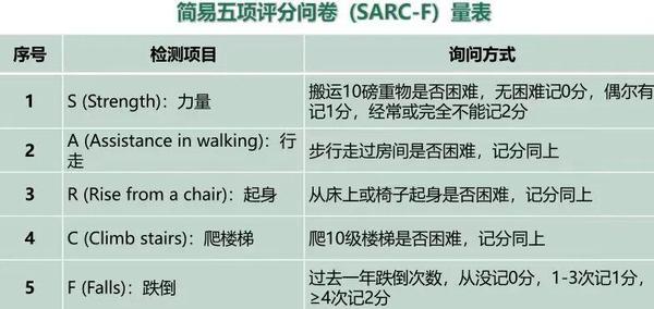 肌少症的筛查可采用简单的五项评分问卷(SARC-F)量表。