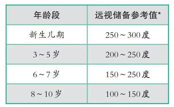 我们可以把远视储备想象成孩子出生时,父母在“视力银行”里给他们存入的一笔“抗击近视基金”,随着孩子身体发育,眼球逐渐长大,眼轴变长,远视储备也会逐渐减少。一般情况下,新生儿期的远视储备约为250~300度,3—5岁为200~250度,6—7岁为150~250度,8—10岁为100~150度,一般约到12—15岁由远视眼发育成正视眼(屈光度为-0.50~ 0.50D),这笔“基金”才会消耗完毕。