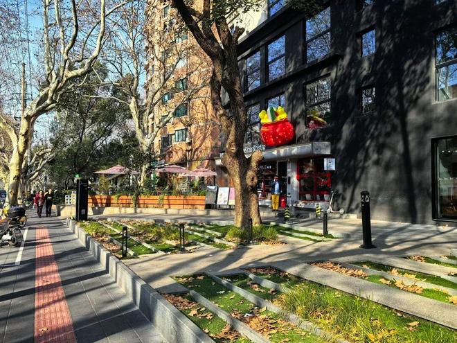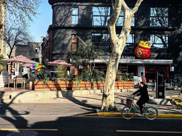 对照新规,这一外摆位堪称教科书式示范:空间上属商户独用部位、位于建筑红线内,未占用人行道;业态上主营咖啡轻餐,符合“咖啡店、轻食餐饮”导向,现场不进行食品加工;环境上,彩虹、绿植与道路两旁的梧桐树相映,契合“提升城市环境品质”要求。在自己的“红线”内把空间让渡给公众,既是最安全的合规,也是最温暖的共享。