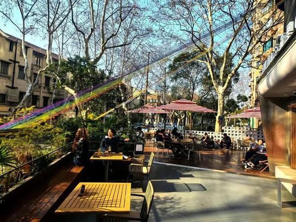 入驻后,徐露和团队在庭院打造上下足功夫:外摆位上空悬挂上彩虹,错落有致地保护着客人隐私的绿植,满足多种需求的长凳、桌椅……客人们可以在这里享受咖啡、点心,松弛感拉满。而庭院两端都设有出入口,方便市民、游客随时进入。徐露说:“无论是否消费,都诚邀大家随时来坐坐,共享阳光和美景。”