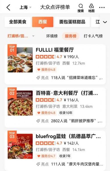 打开大众点评,打浦桥/田子坊区域西餐品类中,环境榜、服务榜、口味榜、打卡人气榜——四张榜单的前三名中,都有fullli福里餐厅。食客们用脚投票,为这个宝藏外摆位盖章认证。