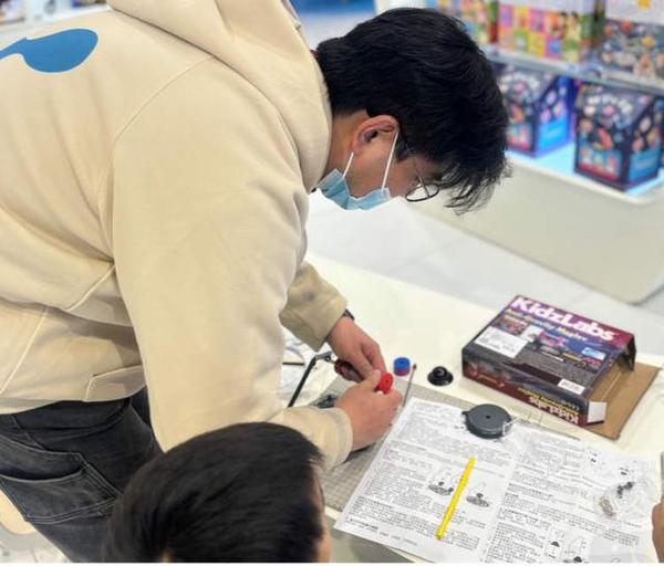 划重点,这里可以现场体验手工指导,购买发动机模型或科学小实验书包的话,可以在商店内工作台、在店员指导下完成拼装,体验时间半小时,相当于上了一趟手工课,对于动手能力还不太强的低龄娃来说,比买回家对着说明书干瞪眼强多了,体验性强,不费家长。
