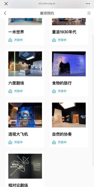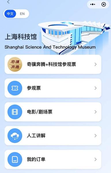门票和电影票/剧场票是在“上海科技馆自然博物馆天文馆门票”小程序内,展项预约则是在“上海科技馆”的公众号内。