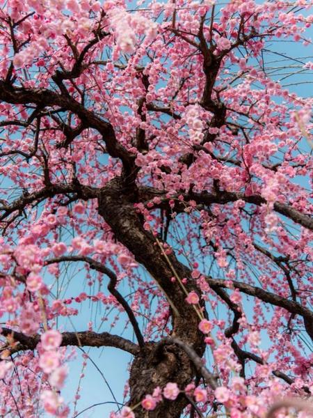 它的枝干虬曲苍劲,如游龙盘桓,配上满树繁花,自有柔中带刚的独特气质,站在树下仰拍,镜头里便是一整片倒挂的花海。