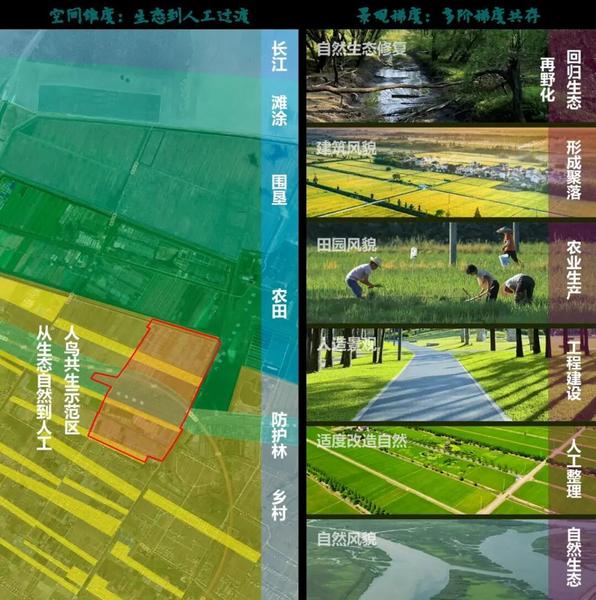 上海东大建筑设计研究院环境院院长黄焱是主要推动者,他介绍,鸟栖湿地稻田采用分层过渡带理念,模拟从生产性农田到自然保护区的梯度生态。“我们这个稻田不是强调未来产量有多高,而是说,我们希望稻田能为植食性的一些鸟类提供一个食源,然后南部就是河漫滩,因为我们这个基地是比较靠近长江口的,它是有这种水的潮涨潮落的抽吸的作用,所以说在这个里面就形成了一个河漫滩的这样一个沟渠形式,然后我们把这些田的形式进行一个保留,做成河漫滩的湿地稻田这样一个风貌。”