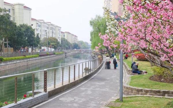 不远处的北潮港畔,几张休闲座椅上坐满了唠家常的老人。“附近两个小区的老人都往这儿跑,这里干净舒服,坐下来聊聊天、看看河景,心情别提多好了。”居民童友元和老伴,几乎每天都会约上老友来这儿坐一坐。风掠过水面,带着岸边的花香飘来,老人们的笑声顺着河道漫开。