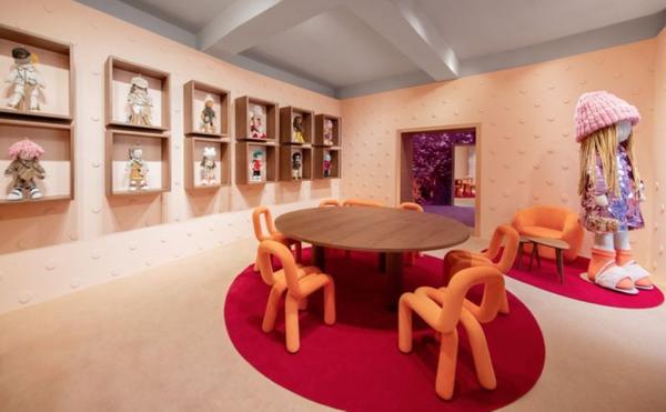 体验空间的视觉设计极具记忆点,外立面采用少女感满格的粉色基底,搭配闪耀的紫色亮片装饰,与门口2.2米高的春节限定BFF挂件相映成趣,软萌姿态中透着顶奢格调,每只BFF Maxi均配有专属身份铭牌,玩趣因子与高定质感巧妙共生。步入室内,波点墙面与亮片装置铺满空间,暖黄储物柜与橙意曲面座椅的撞色设计,打破传统奢华的沉闷感,既营造出浓郁新春氛围,又传递出如居家般的松弛意趣,各个细节都藏着节日仪式感。
