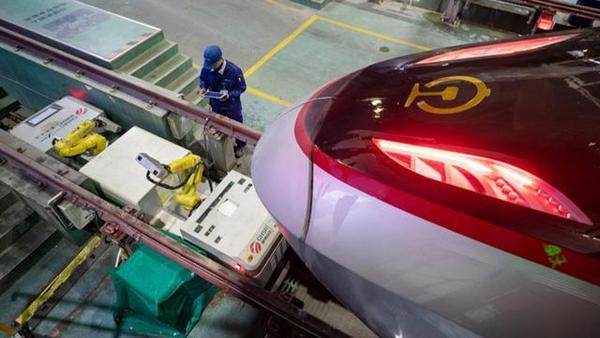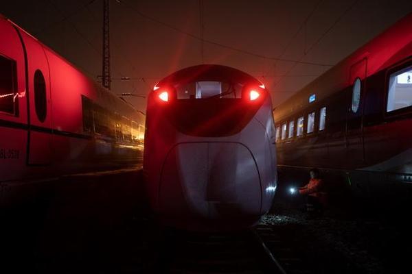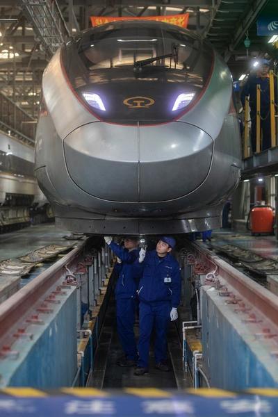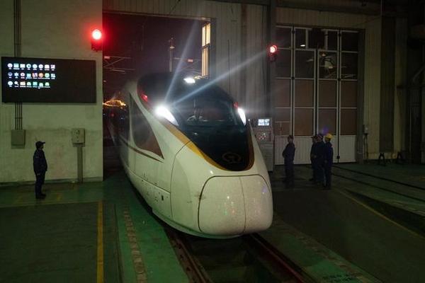 复兴号动车组结束一天的运营任务后驶入车库进行检修。
