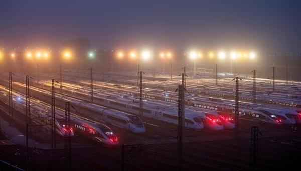 2月2日早晨6:44,太阳还未升起,随车机械师们正拖着工具箱走向他们今天值乘的列车。一列完成检修工作的动车组列车正朝着上海虹桥站方向行驶。